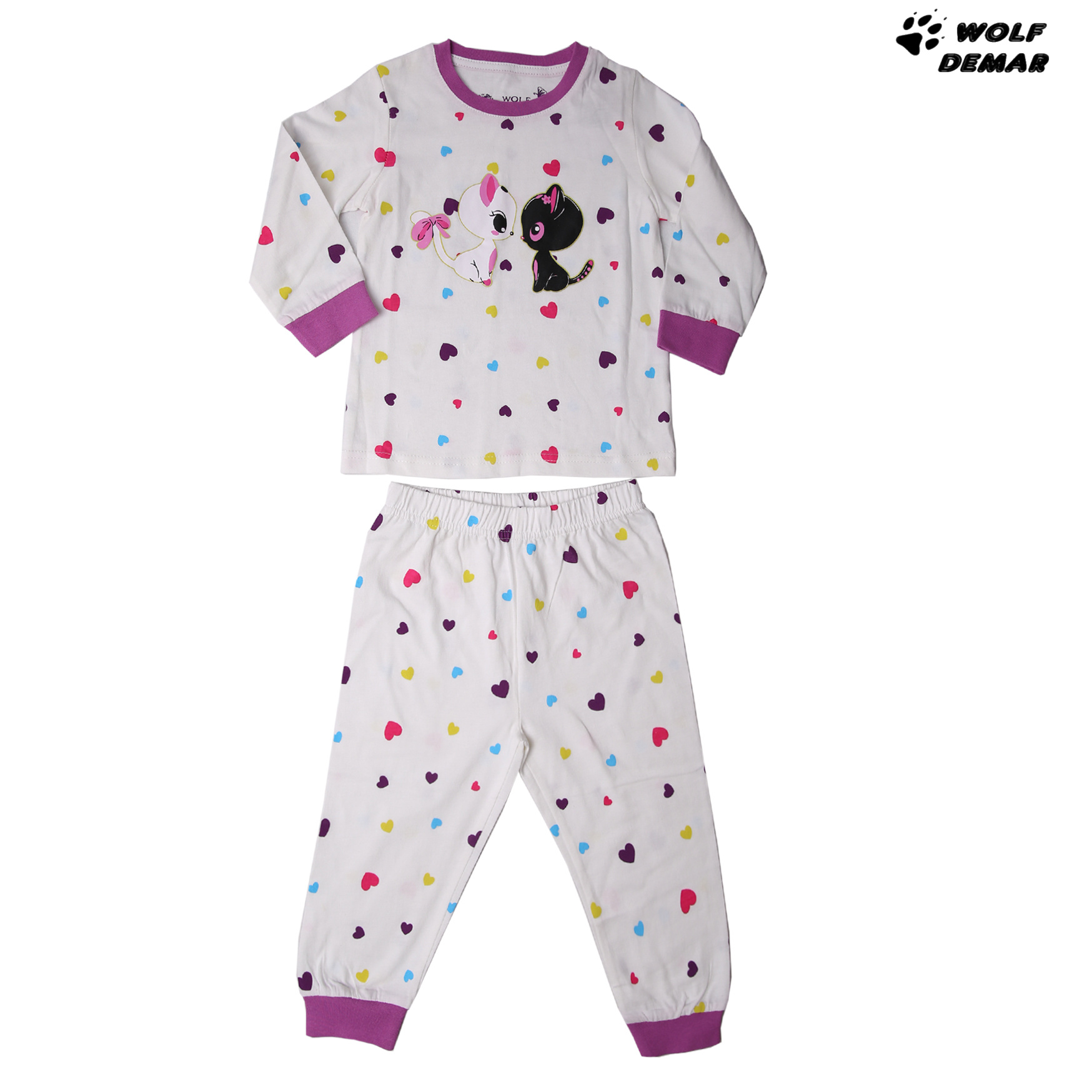 Dětské dívčí pyžamo ze 100% bavlny z kolekce Wolf jaro/léto 2021. Rukávy a nohavice pyžama Wolf zakončeny do lemu. Na triku potisk, kalhoty je potisk srdíček. Dívčí pyžamo Wolf je vyrobeno z příjemného a kvalitního bavlněného materiálu.