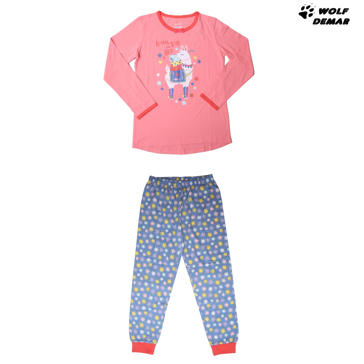 Dětské dívčí junior pyžamo ze 100% bavlny z kolekce Wolf jaro/léto 2021. Rukávy a nohavice pyžama Wolf zakončeny do lemu. Na triku je obrázek s lamou, kalhoty jsou potištěné hvězdami. Dívčí pyžamo Wolf je vyrobeno z příjemného a kvalitního materiálu.