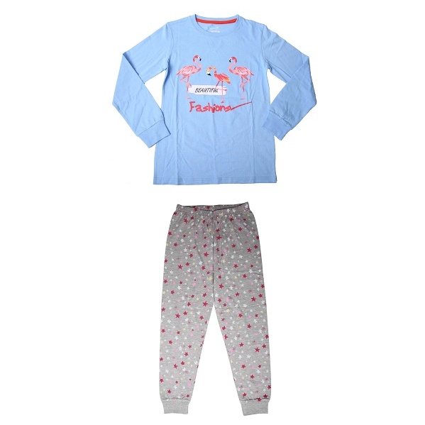 Dětské dívčí junior pyžamo ze 100% bavlny z kolekce Wolf podzim/zima 2022. Rukávy a nohavice pyžama Wolf zakončeny do lemu. Na triku je obrázek plameňáků, kalhoty jsou jednobarevné s potiskem hvězdiček. Dívčí pyžamo Wolf je vyrobeno z příjemného a kvalitního materiálu.