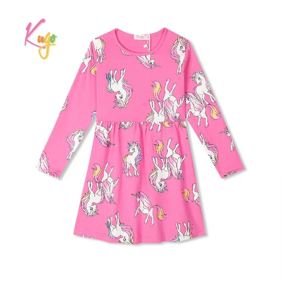 Dívčí bavlněné šaty Kugo s dlouhým rukávem a obrázky koníků. Šaty jsou střižené do "áčka", v pase není možné stáhnout.