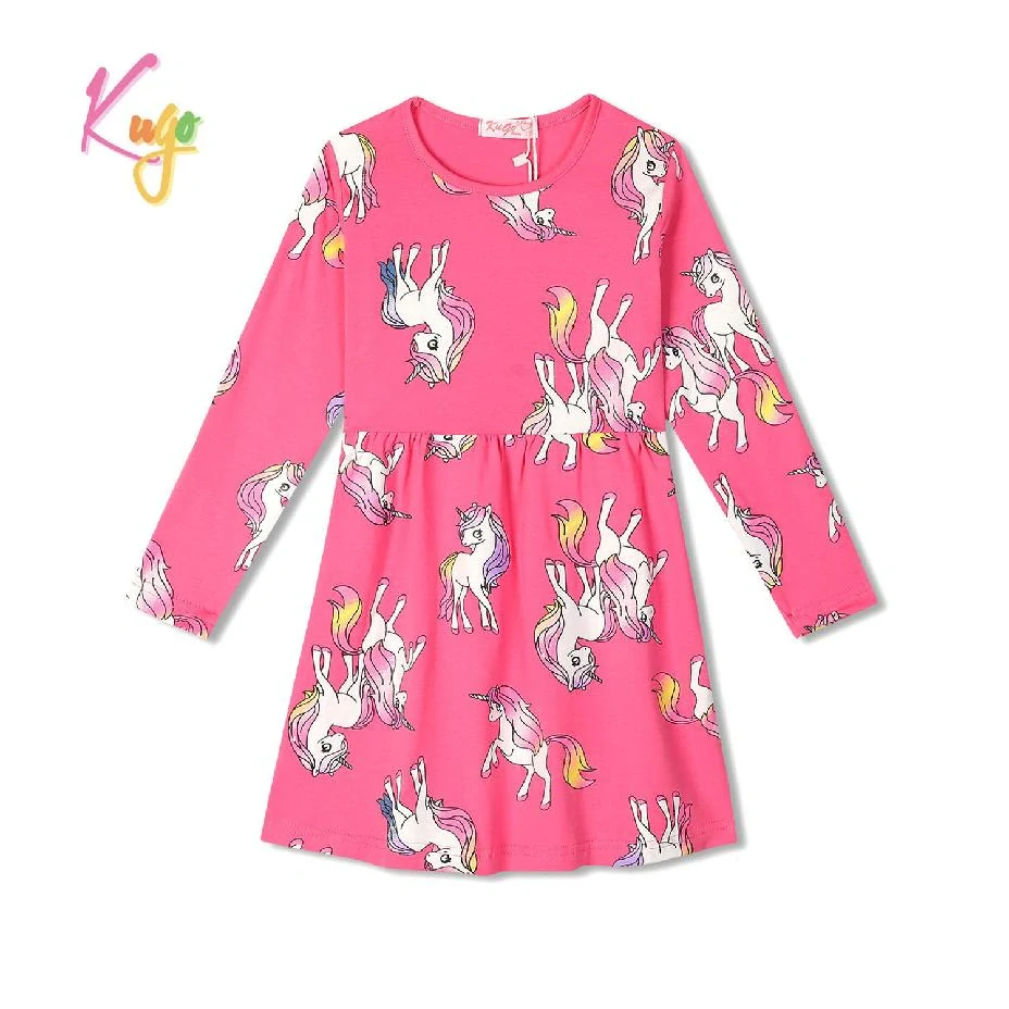 Dívčí bavlněné šaty Kugo s dlouhým rukávem a obrázky koníků. Šaty jsou střižené do "áčka", v pase není možné stáhnout.
