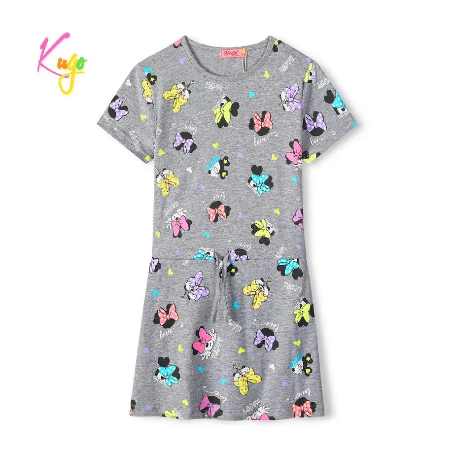 Dívčí bavlněné šaty Kugo s obrázky myšky Minnie. Šaty jsou s krátkým rukávem a v pase je šňůrka na stažení protažená tunýlkem. Šaty jsou střižené do "áčka".