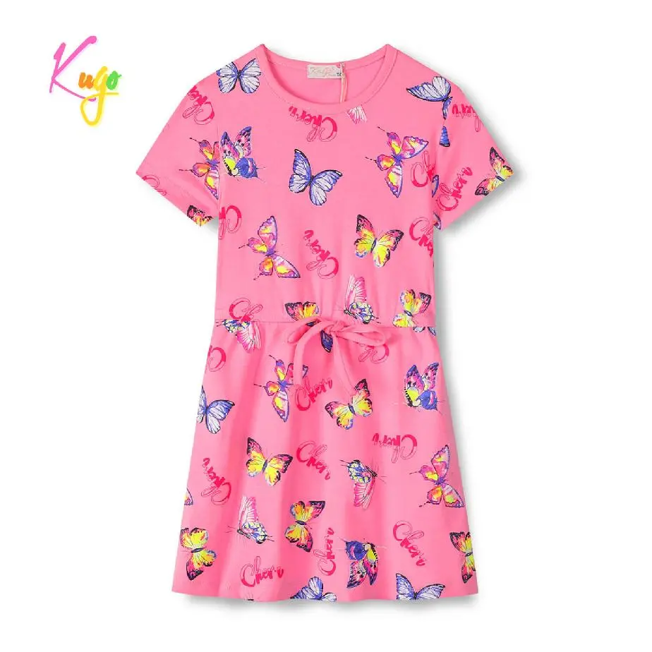 Dívčí bavlněné šaty KUGO s obrázky motýlů. Šaty jsou s krátkým rukávem a v pase je šňůrka na stažení protažená tunýlkem. Šaty jsou střižené do "áčka".