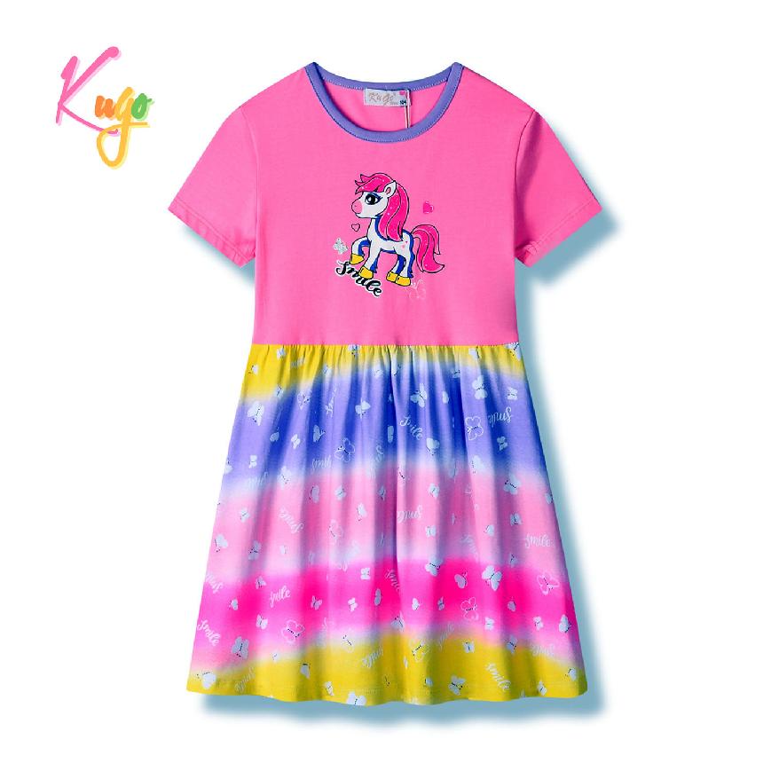 Letní dívčí šaty Kugo s obrázkem poníka a duhovou sukní. Šaty jsou s krátkým rukávem a v pase není možné stáhnutí. Šaty jsou střižené do "áčka".