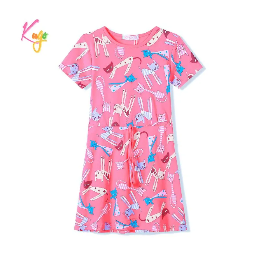 Dívčí bavlněné šaty KUGO s obrázky kočiček. Šaty jsou s krátkým rukávem a v pase je šňůrka na stažení protažená tunýlkem. Šaty jsou střižené do "áčka".