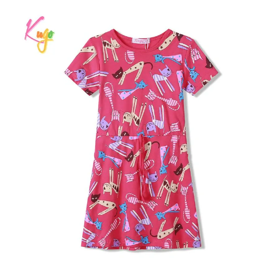 Dívčí bavlněné šaty KUGO s obrázky kočiček. Šaty jsou s krátkým rukávem a v pase je šňůrka na stažení protažená tunýlkem. Šaty jsou střižené do "áčka".
