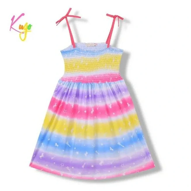 Dívčí duhové letní šaty Kugo na ramínka s obrázky. Ramínka jsou zavazovací, vrchní část šatů je žebrovaná, sukně volná.