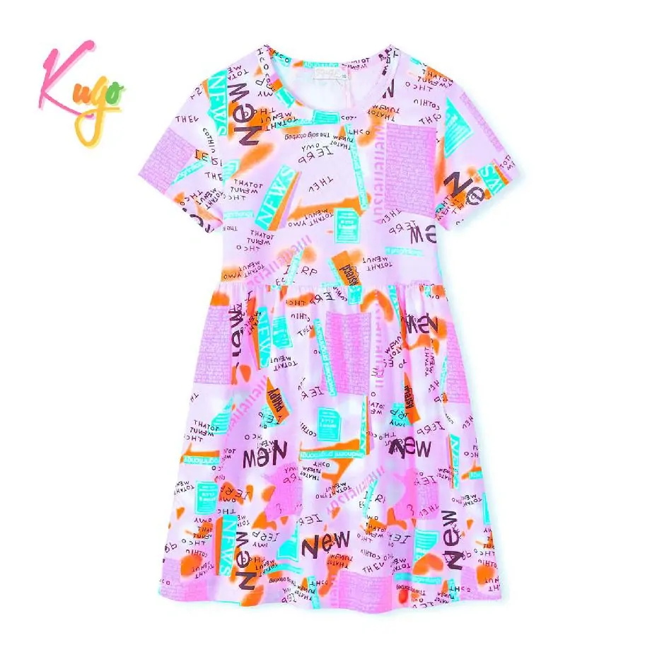 Dívčí bavlněné šaty Kugo s nápisy v moderním designu. Šaty jsou s krátkým rukávem a v pase je šňůrka na stažení protažená tunýlkem. Šaty jsou střižené do "áčka".