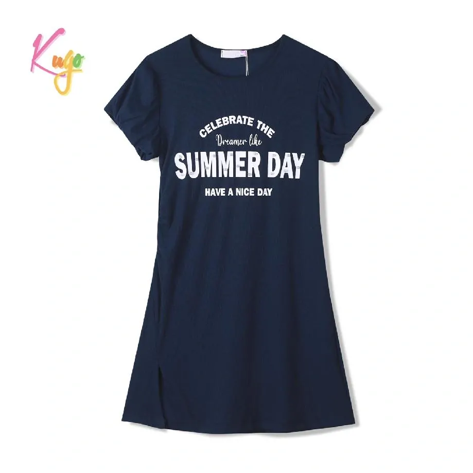Dívčí junior šaty Kugo s nápisem na předním dílu. Šaty jsou s krátkými řasenými rukávy, na pravé straně mírně v předu je rozparek a v podpaždí je všitá gumička pro stylové řasení. Šaty jsou střižené do "áčka". Příjemný a lehký žebrovaný materiál.