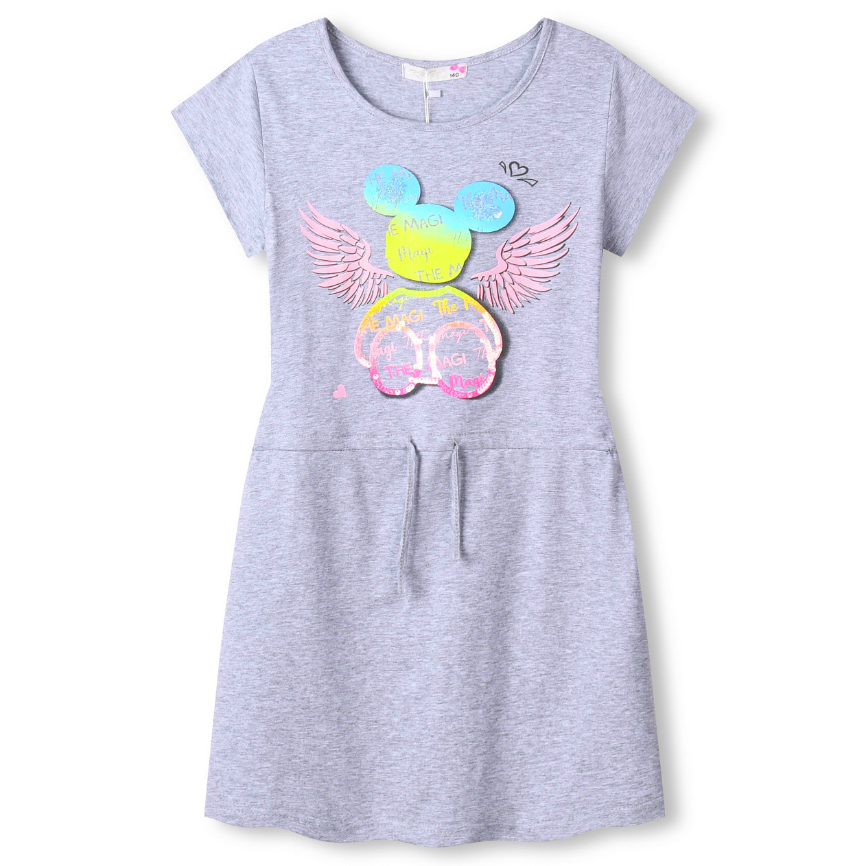 Dívčí junior šaty KUGO s obrázkem na předním dílu. Šaty jsou s krátkým rukávm a v pase je šňůrka na stažení protažená tunýlkem. Šaty jsou střižené do "áčka".