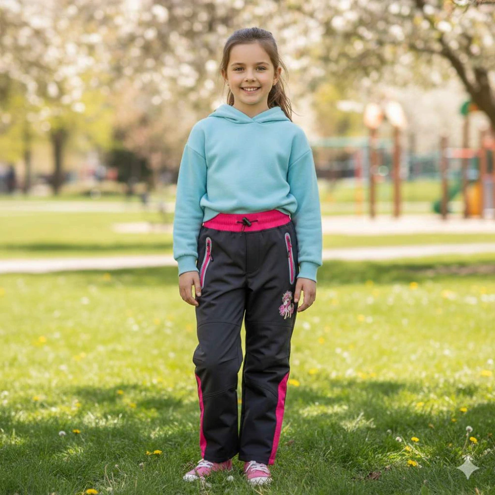Oblíbené dětské nezateplené softshellové kalhoty Kugo pro holky. Softshellky jsou vyrobené z vodoodpudivého prodyšného materiálu odolného vůči povětrnostním vlivům. Kalhoty mají v pase gumu se šňůrkou. Na konci nohavic je šusťáková zábrana proti sněhu, která je stažena do gumičky pro přetažení přes boty. V předu jsou dvě funkční kapsy se zapínáním na zip.