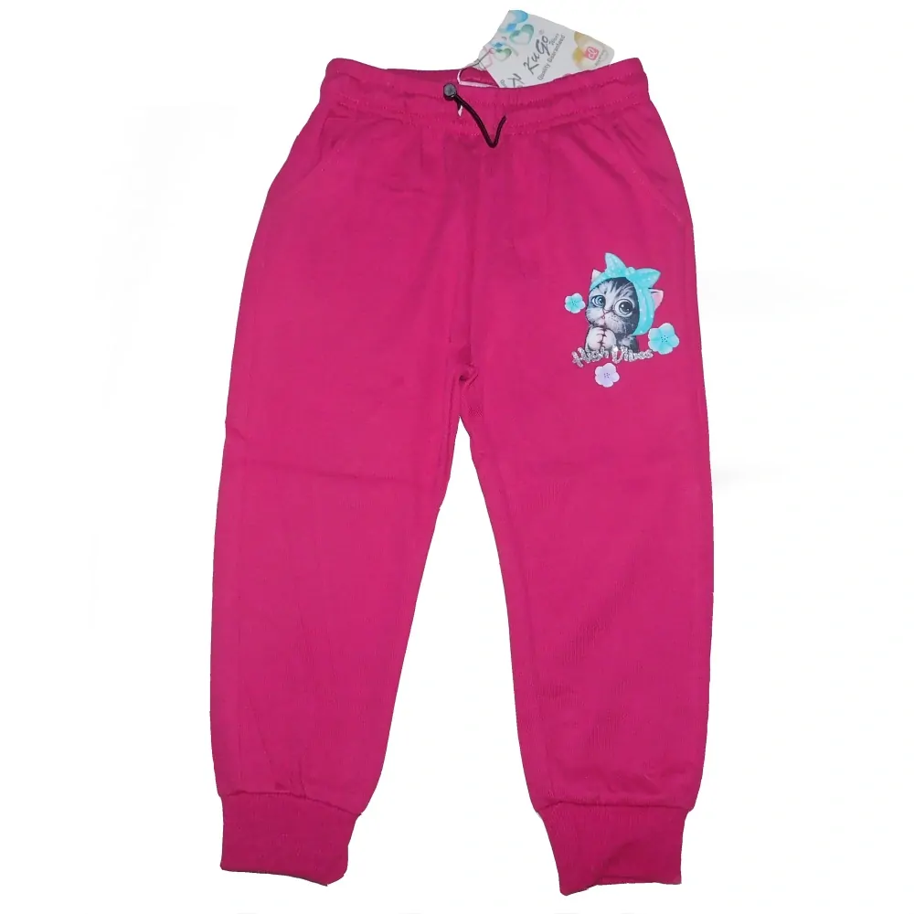Oblíbené bavlněné dívčí tepláky Kugo na běžné nošení, sport, do školky a školy nebo v chladném počasí pod kalhoty. Na nohavici pod kapsou je nažehlený obrázek kočičky a nápis, druhá nohavice je bez obrázků jednobarevná.