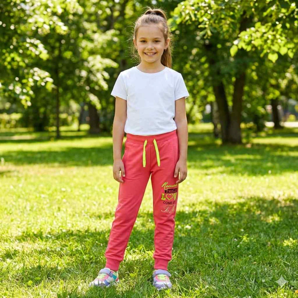 Oblíbené bavlněné dívčí tepláky Kugo na běžné nošení, sport, do školky a školy nebo v chladném počasí pod kalhoty. Tepláky jsou jahodově růžové barvy, na nohavici pod kapsou je nažehlený nápis, druhá nohavice je bez obrázků.