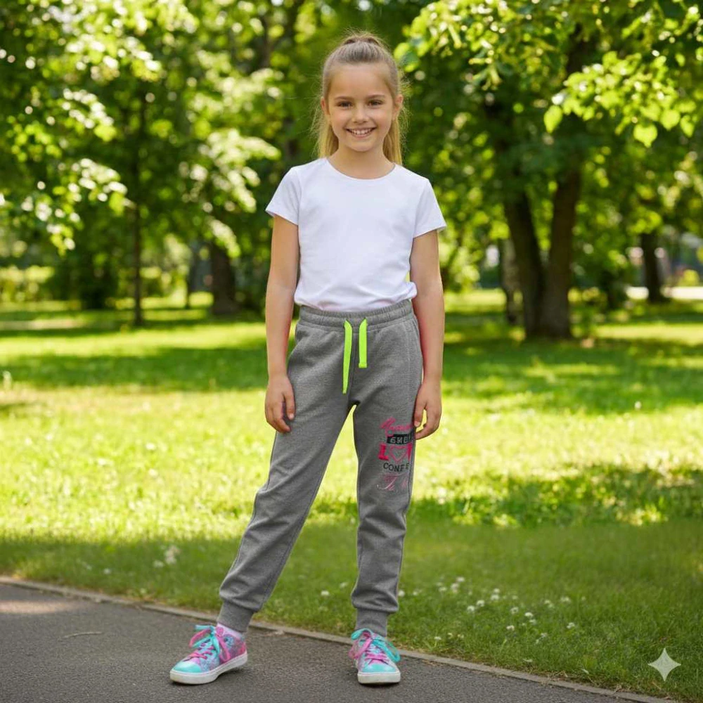 Oblíbené bavlněné dívčí tepláky Kugo na běžné nošení, sport, do školky a školy nebo v chladném počasí pod kalhoty. Tepláky jsou melírované, na nohavici pod kapsou je nažehlený nápis, druhá nohavice je bez obrázků.
