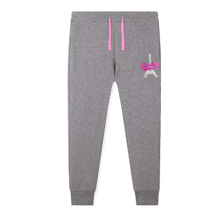 Oblíbené bavlněné dívčí tepláky Kugo na běžné nošení, sport, do školky a školy nebo v chladném počasí pod kalhoty. Na nohavici pod kapsou je nažehlený obrázek - Eiffelova věž s nápisem, druhá nohavice je bez obrázků.