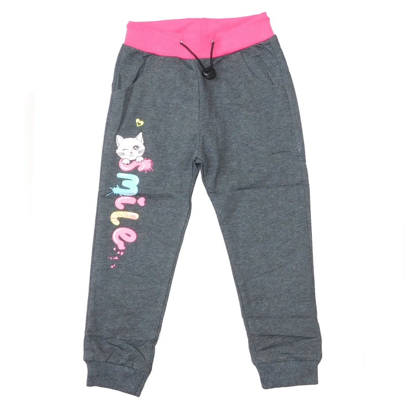 Oblíbené bavlněné dívčí tepláky Kugo na běžné nošení, sport, do školky a školy nebo v chladném počasí pod kalhoty. Na nohavici pod kapsou je nažehlený obrázek kočičky a nápis smile, na druhá nohavice je bez obrázků jednobarevná.