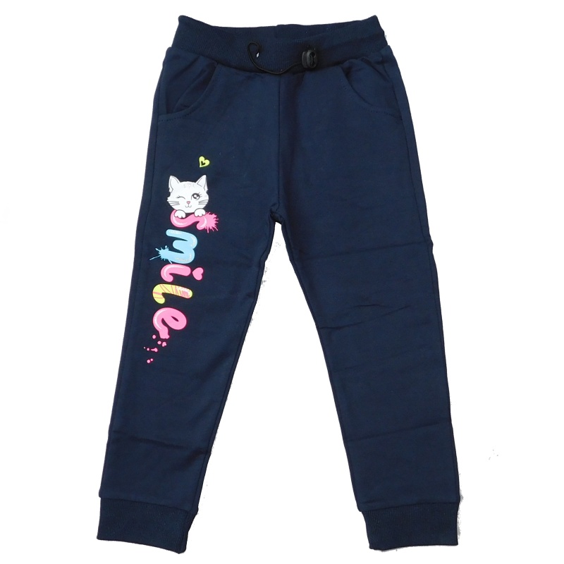 Oblíbené bavlněné dívčí tepláky Kugo na běžné nošení, sport, do školky a školy nebo v chladném počasí pod kalhoty. Na nohavici pod kapsou je nažehlený obrázek kočičky a nápis smile, na druhá nohavice je bez obrázků jednobarevná.