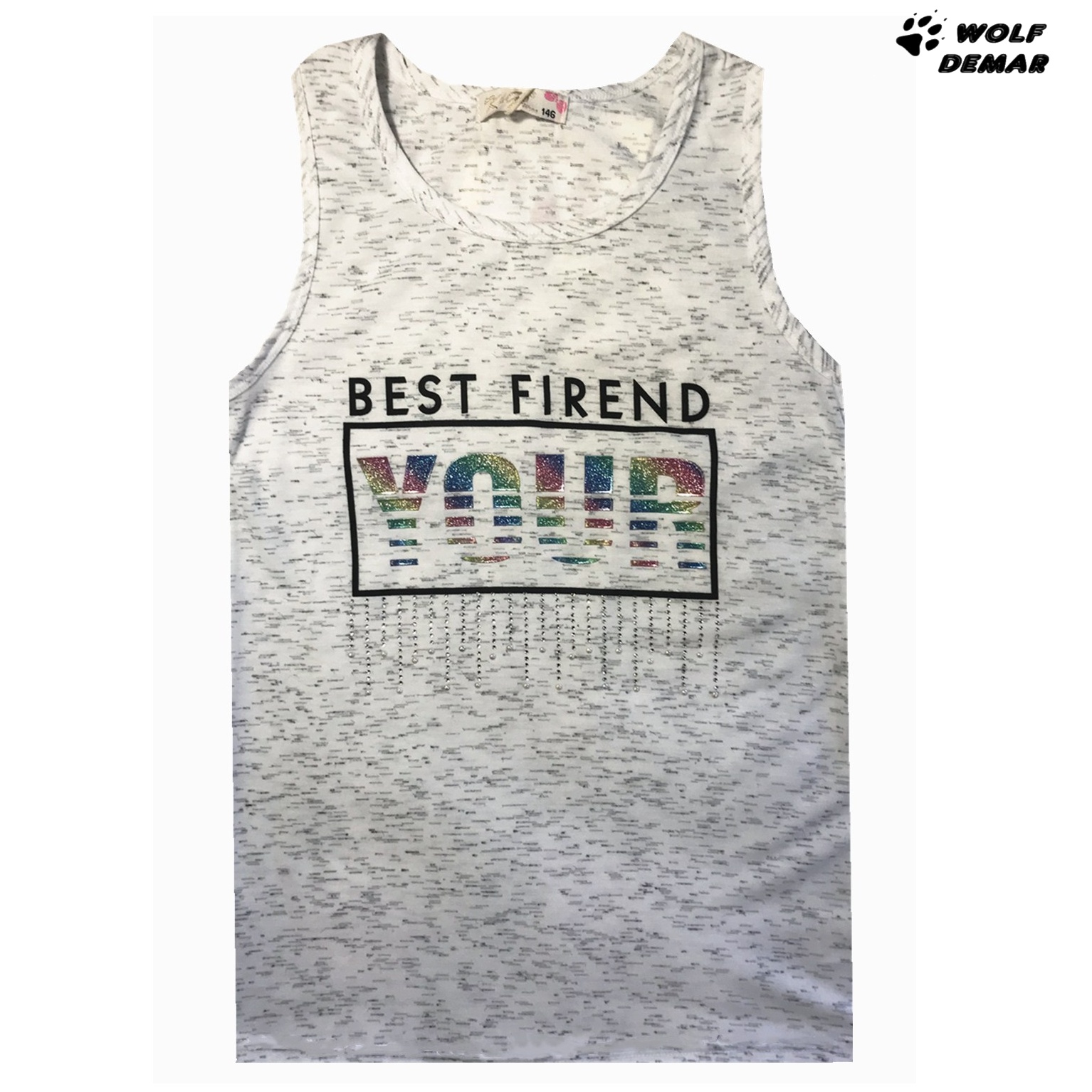 Krásné dívčí bavlněné tílko od firmy Kugo s nápisem na předním dílu. Dívčí tílko Kugo je vyrobeno z příjemného kvalitního bavlněného materiálu. Na předním dílu je obrázek. Zadní díl trička je jednobarevný.