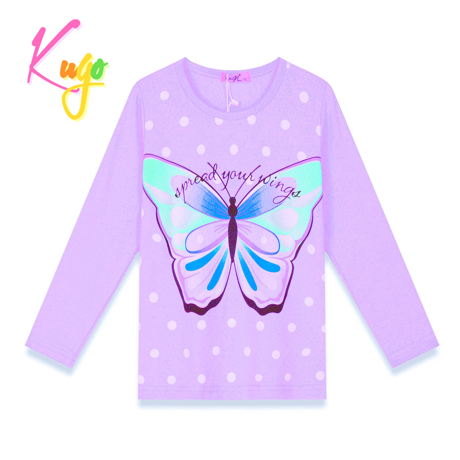 Stylové dívčí tričko s dlouhým rukávem od firmy Kugo s obrázkem motýla na předním dílu. Tričko má přední díl kratší než zadní díl.