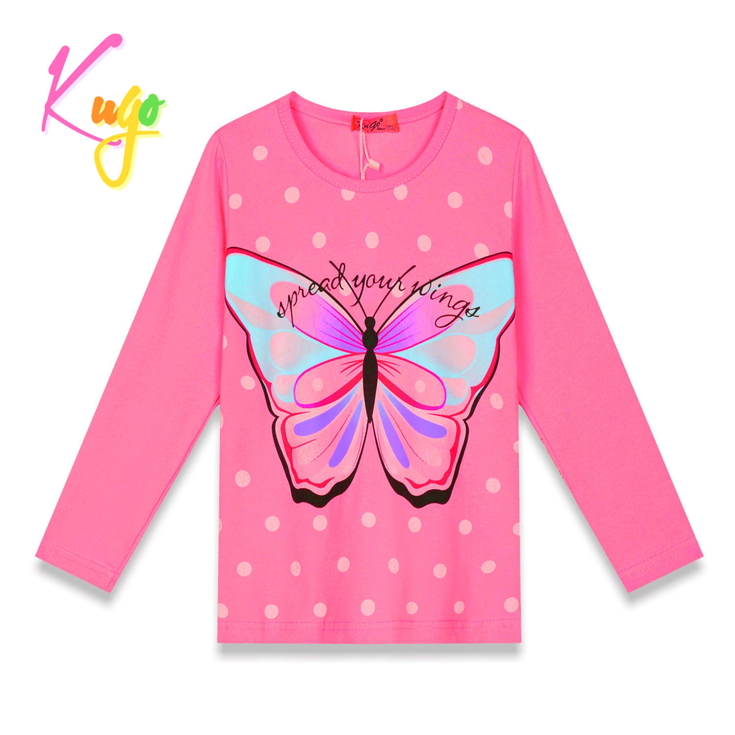 Stylové dívčí tričko s dlouhým rukávem od firmy Kugo s obrázkem motýla na předním dílu. Tričko má přední díl kratší než zadní díl.