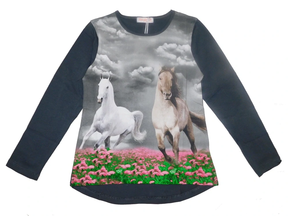 Moderní dívčí tričko s dlouhým rukávem značky Kugo s obrázkem koní na předním dílu. Tričko je vyrobené z kvalitního bavlněného materiálu s příměsí elastanu pro zachování tvaru.
