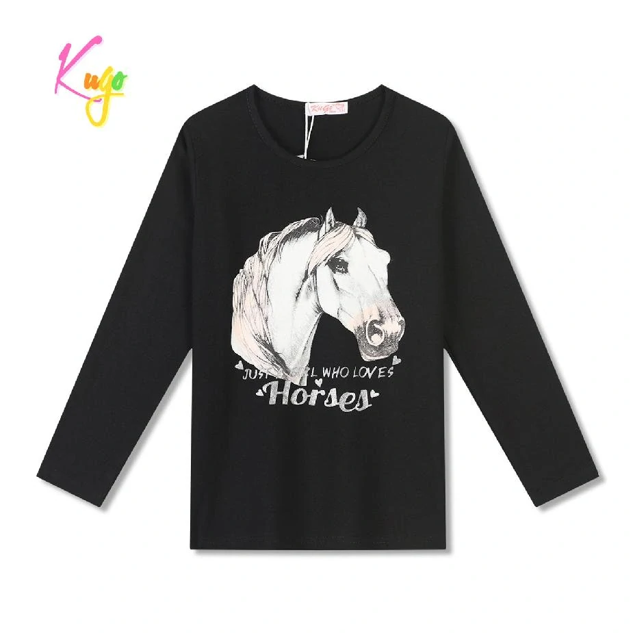 Moderní dívčí tričko s dlouhým rukávem značky Kugo s obrázkem koně na předním dílu. Tričko je vyrobené z kvalitního bavlněného materiálu s příměsí elastanu pro zachování tvaru.