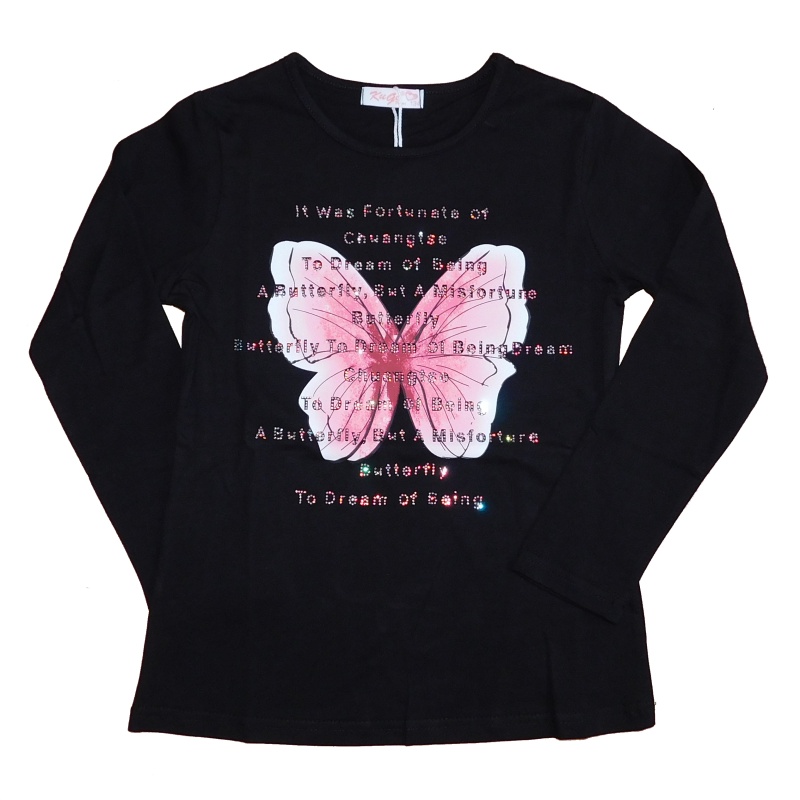Moderní dívčí tričko s dlouhým rukávem od firmy Kugo s nápisem a obrázkem na předním dílu. Tričko je vyrobené z kvalitního bavlněného materiálu s příměsí elastanu pro zachování tvaru. Na předním dílu je velký obrázek motýla a nápis v angličtině polepený flitry.