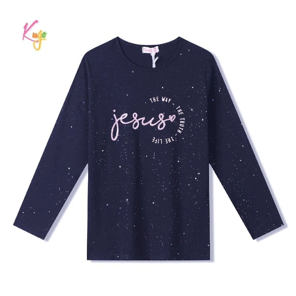 Stylové dívčí tričko Kugo v elegantní tmavě modré barvě okouzlí každou slečnu, která má ráda módní a originální oblečení. Tričko je zdobeno jemnými třpytkami a růžovým nápisem „Jesus – The way, the truth, the life“, který krásně kontrastuje s tmavým podkladem.
