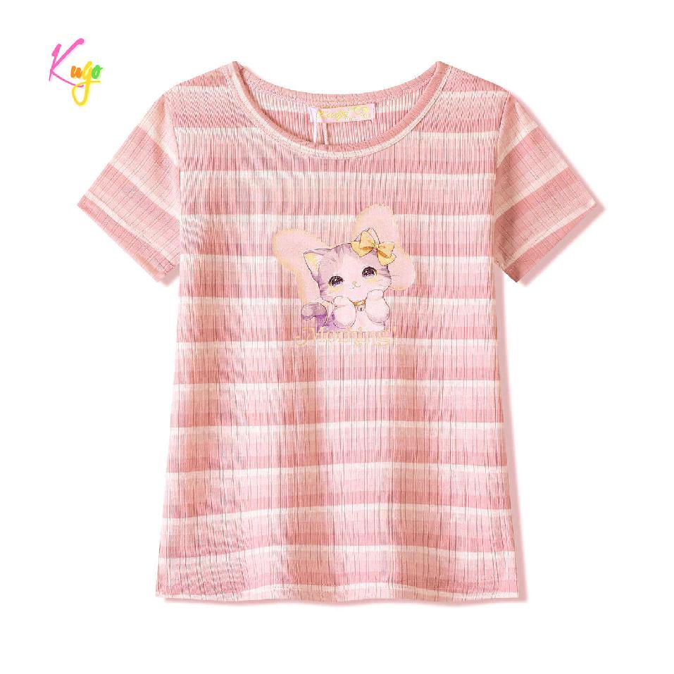 Dívčí bavlněné tričko značky Kugo s krátkým rukávem a obrázkem kočičky. Tričko je vyrobeno z příjemného bavlněného žebrovaného materiálu s příměsí elastanu, proužky jsou v předu i v zadu.