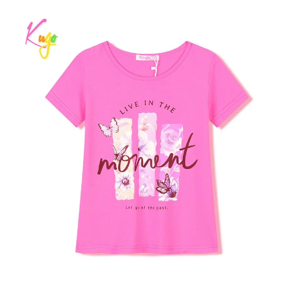 Dívčí bavlněné tričko Kugo s krátkým rukávem a obrázkem s jarním motivem. Tričko je vyrobeno z příjemného bavlněného materiálu s příměsí elastanu 5%. Kvalitní, moderní a šik kousek oblečení do dívčího šatníku.