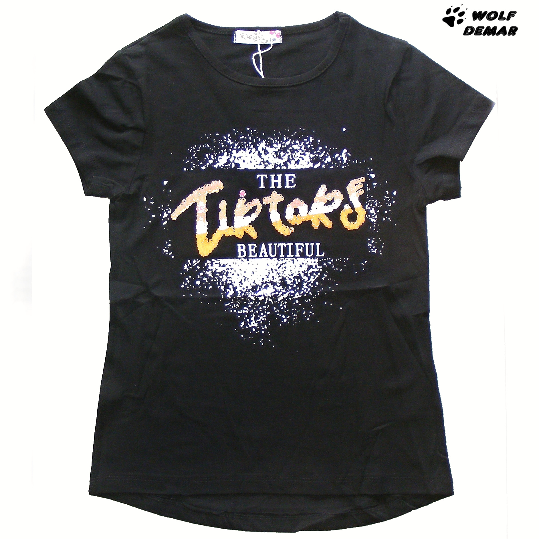 Krásné dívčí tričko s krátkým rukávem z jarní kolekce KUGO 2021. Tričko má na přední straně potisk a nápis z flitrů "TikTok", přední díl je kratší než zadní. Rukávy jsou krátké.