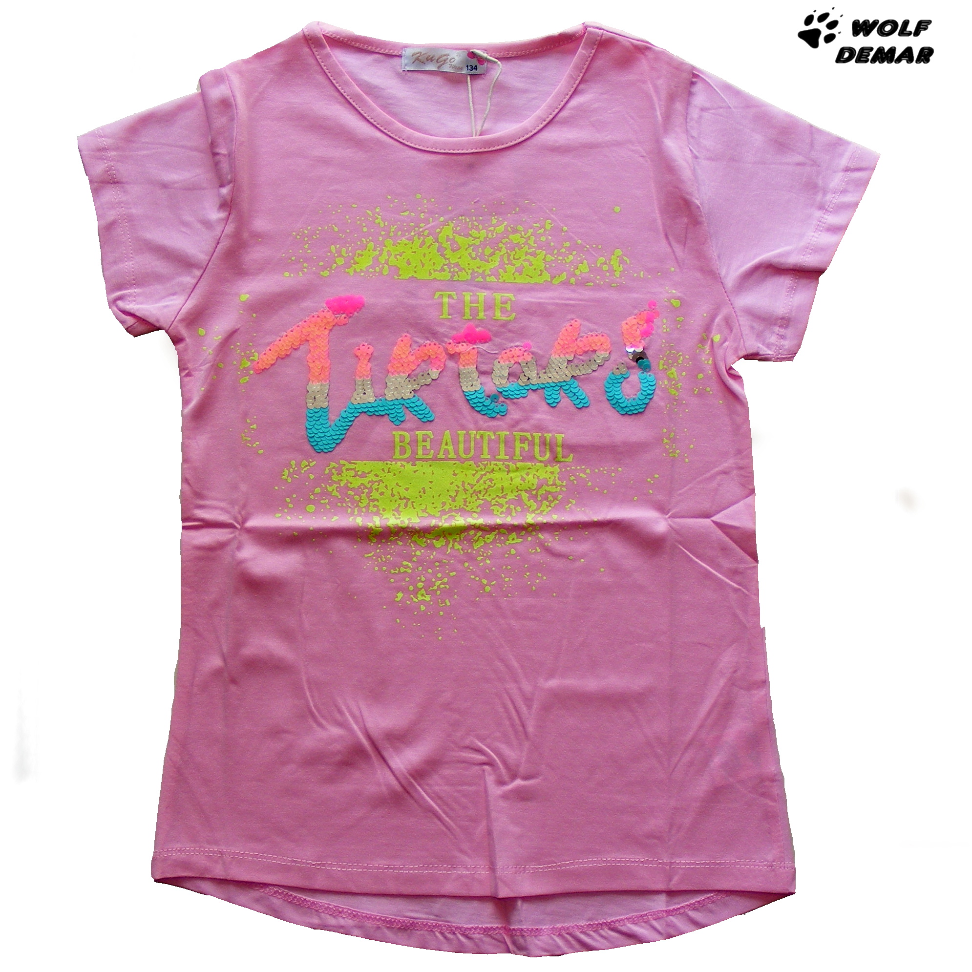 Krásné dívčí tričko s krátkým rukávem z jarní kolekce KUGO 2021. Tričko má na přední straně potisk a nápis z flitrů "TikTok", přední díl je kratší než zadní. Rukávy jsou krátké.