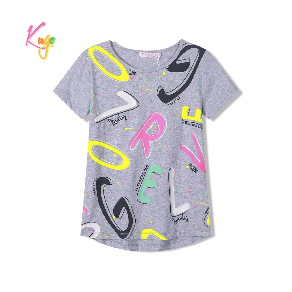 Moderní dívčí tričko značky Kugo v juniorských velikostech. Na předním dílu má tričko nápisy, zadní díl je jednobarevný. Zadní díl je delší než přední.