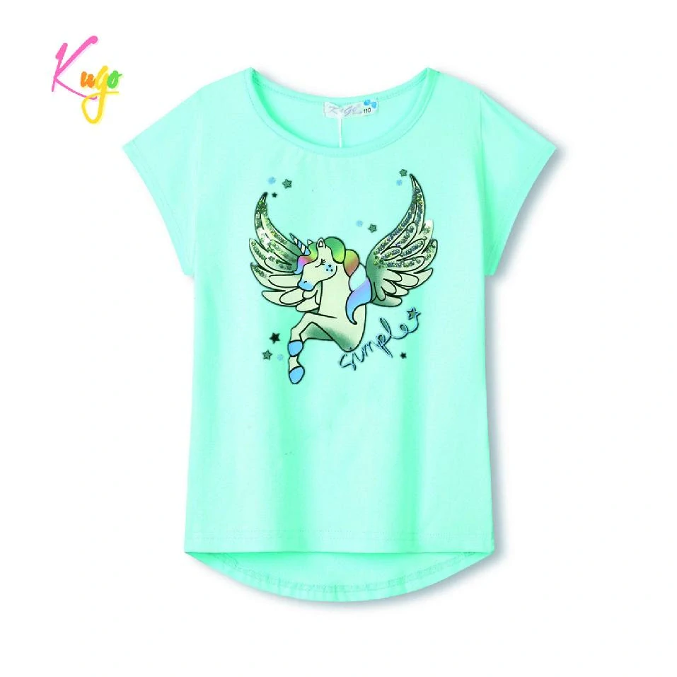 Dívčí bavlněné tričko značky Kugo s krátkým rukávem a obrázkem jednorožce. Tričko Kugo je vyrobeno z příjemného bavlněného materiálu s příměsí elastanu, na předním dílu je obrázek, zadní díl je jednobarevný.