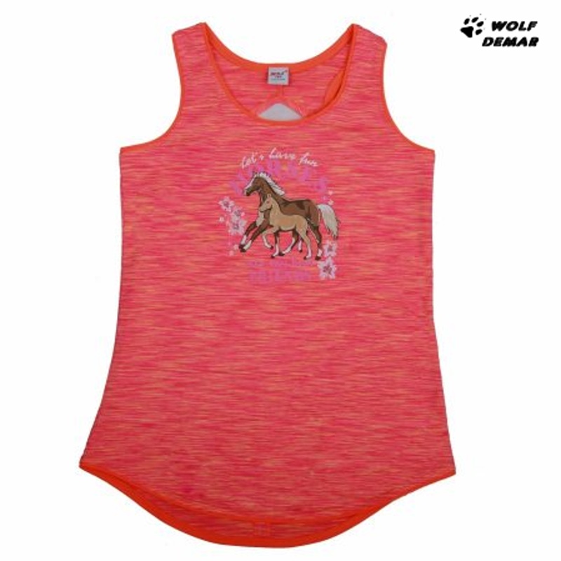 Krásné dívčí tričko bez rukávu od firmy Wolf z kolekce jaro/léto 2020. Triko je vyrobeno z rychleschnoucího materiálu, vpředu je obrázek s koňmi, zadní díl je delší.