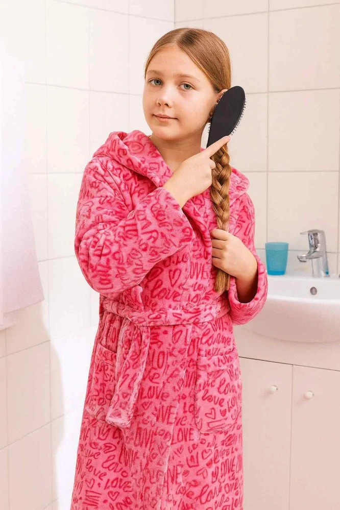 Dívčí župan Wolf & Wolfie Z2593 v něžné růžové barvě s motivem „LOVE“ je skvělou volbou pro holky, které chtějí pohodlí a měkkost po koupání nebo při domácím relaxu. Vyrobený je ze 100 % polyesteru s krátce střiženým chloupkem — materiál je huňatý, hebký a hřejivý.