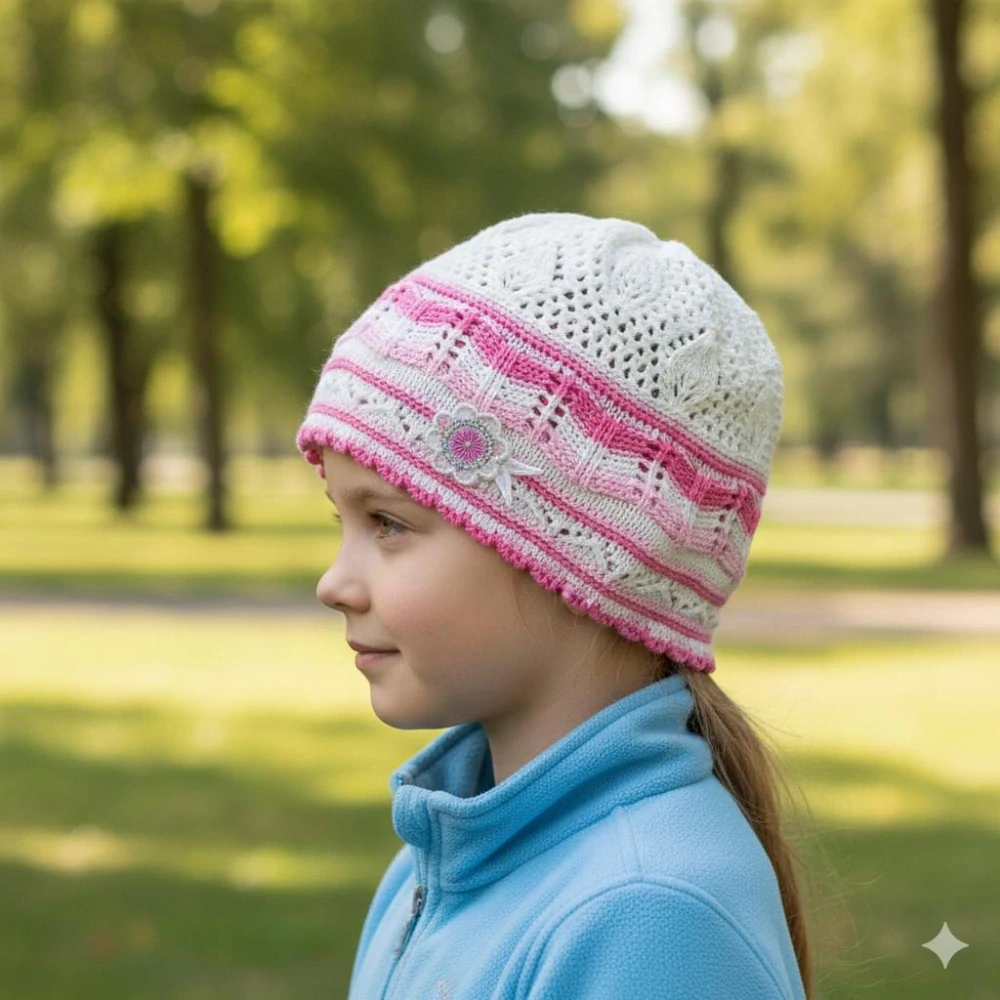 Lehká a elegantní háčkovaná dívčí čepice je ideálním doplňkem na jaro, léto i teplejší podzimní dny. Díky 100% bavlně je čepice příjemná na nošení, prodyšná a šetrná k dětské pokožce. Skvěle se hodí jak na běžné nošení, tak i na rodinné oslavy nebo focení.