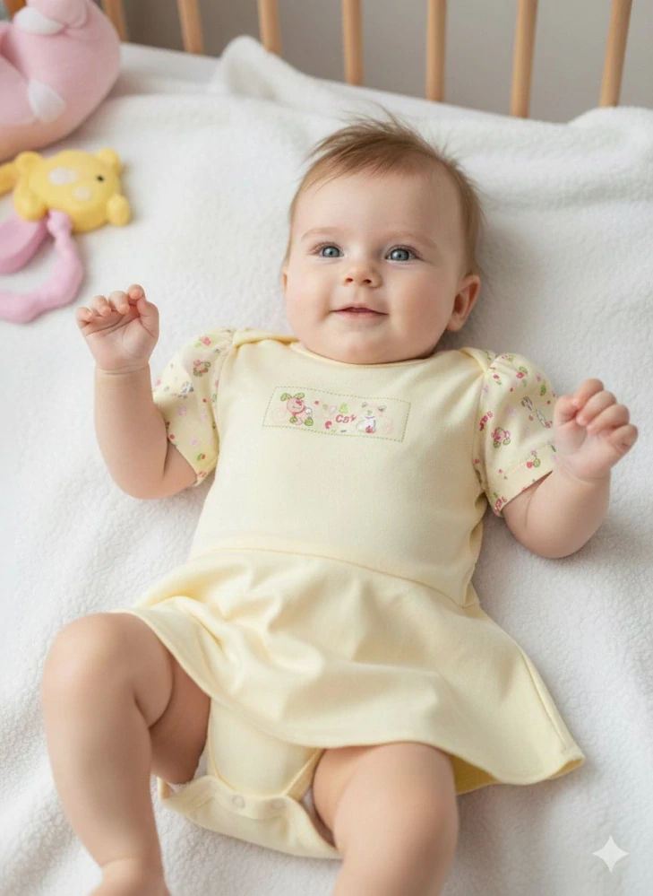 Nápadité kojenecké bodýčko s krátkým rukávem a sukýnkou Ewa Plastuš. Bodýčko ma zapínání na cvočky na ramínku a mezi nožičkami a to usnadňuje oblékání a přebalování. Velice příjemňoučký a kvalitní materiál, který je ideální pro miminka. Bodýčko vás okouzlí svým roztomilým motivem, který bude vašemu miminku velmi slušet.
