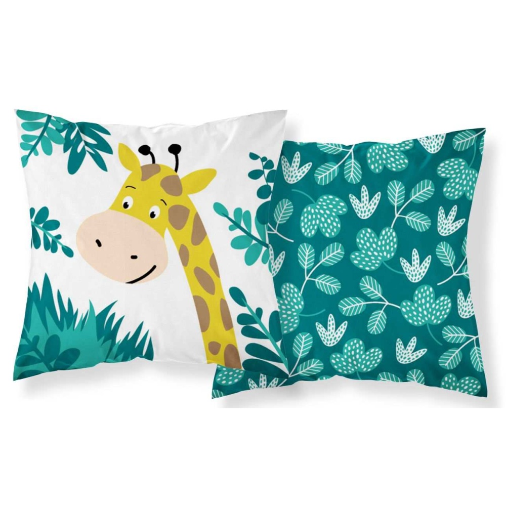 Krásný povlak na polštářek od firmy Detexpol s obrázkem žirafy v zeleném provedení. Povlak na polštářek je vyroben ze 100% bavlny se zapínáním na zip. Z každé strany povlaku je jiný motiv.