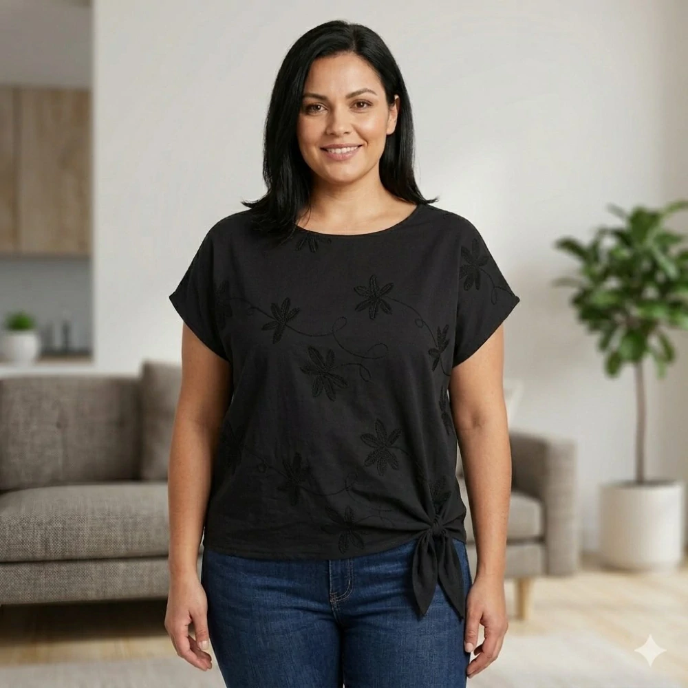 Stylové a pohodlné dámské tričko, které si oblíbí maminky i dospívající dívky. Díky zajímavému střihu s ozdobným uzlem na boku působí moderně a zároveň velmi žensky. Skvěle se hodí k džínám, kalhotám i sukni – ideální na běžné nošení i volný čas.