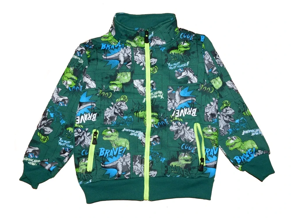 Chlapecká silnější mikina se zapínáním na zip značky Kugo pro chladné počasí. Mikina je vyrobena ze silné bavlny uvnitř s chloupkem. Moderní a kvalitní mikina pro kluky s dinosaury.