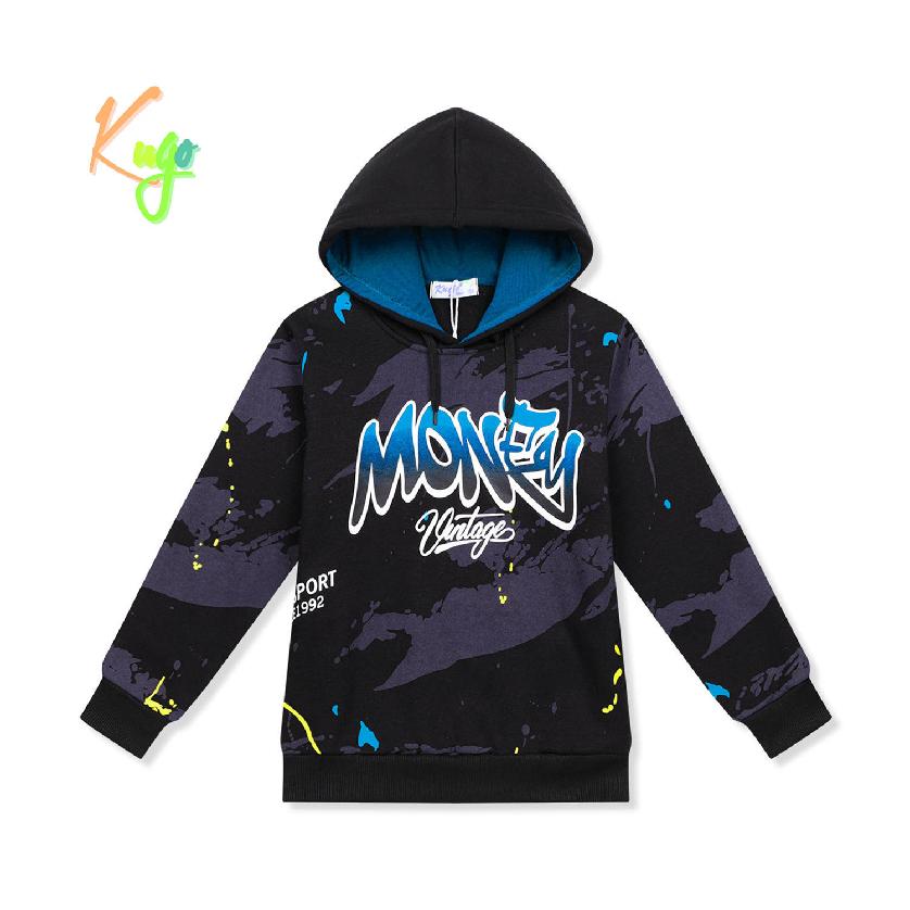 Chlapecká mikina přes hlavu s kapucí Kugo FM0328 s nápisem na předním dílu. Mikina je teplejší, uvnitř jemný chloupek, rukávy a spodní díl mikiny jsou ukončené lemem.