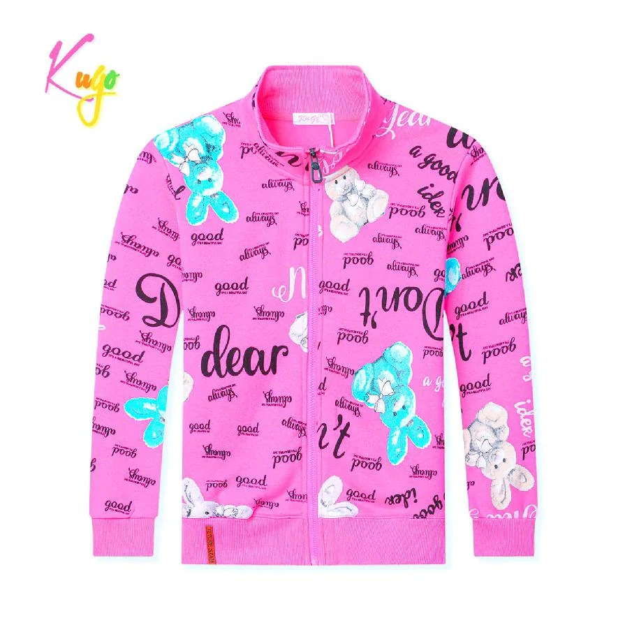 Dívčí silnější mikina se zapínáním na zip značky Kugo pro chladné počasí. Mikina je vyrobena ze silné bavlny uvnitř s chloupkem. Moderní a kvalitní mikina pro dívky s nápisy a zajíčky.