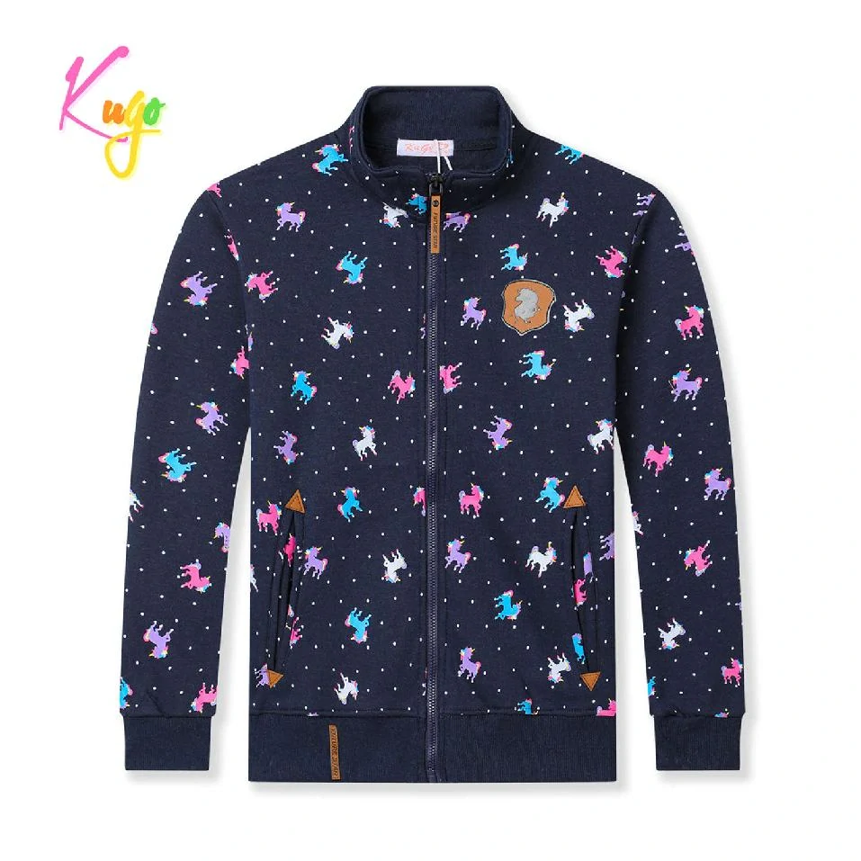 Dívčí silnější mikina se zapínáním na zip značky Kugo pro chladné počasí. Mikina je vyrobena ze silné bavlny uvnitř s chloupkem. Moderní a kvalitní mikina pro dívky s obrázky jednorožců.