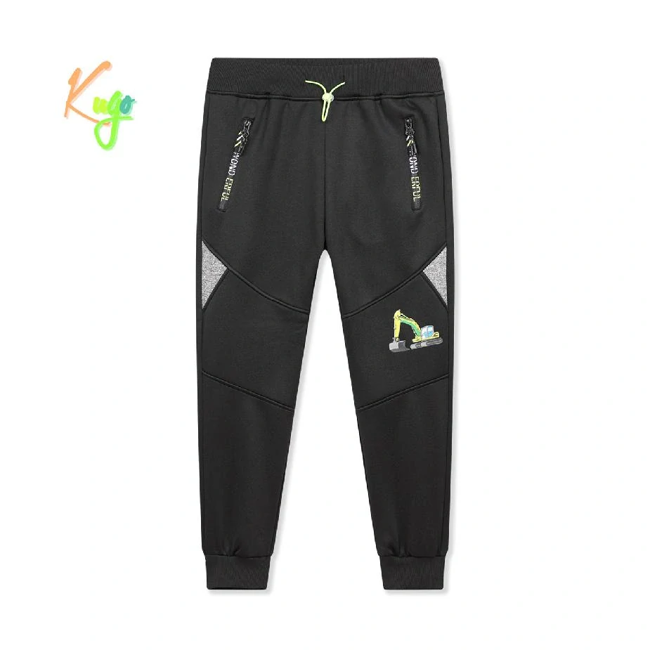 Oblíbené dětské softshellové tepláky od firmy Kugo vhodné pro podzimní radovánky venku, na sport nebo do školky a školy. Tepláky jsou v pase do gumy se šňůrkou na stažení, nohavice ukončeny do lemu, vpředu dvě kapsy na zip. Uvnitř tepláků je jemný chloupek, na nohavici obrázek bagra.