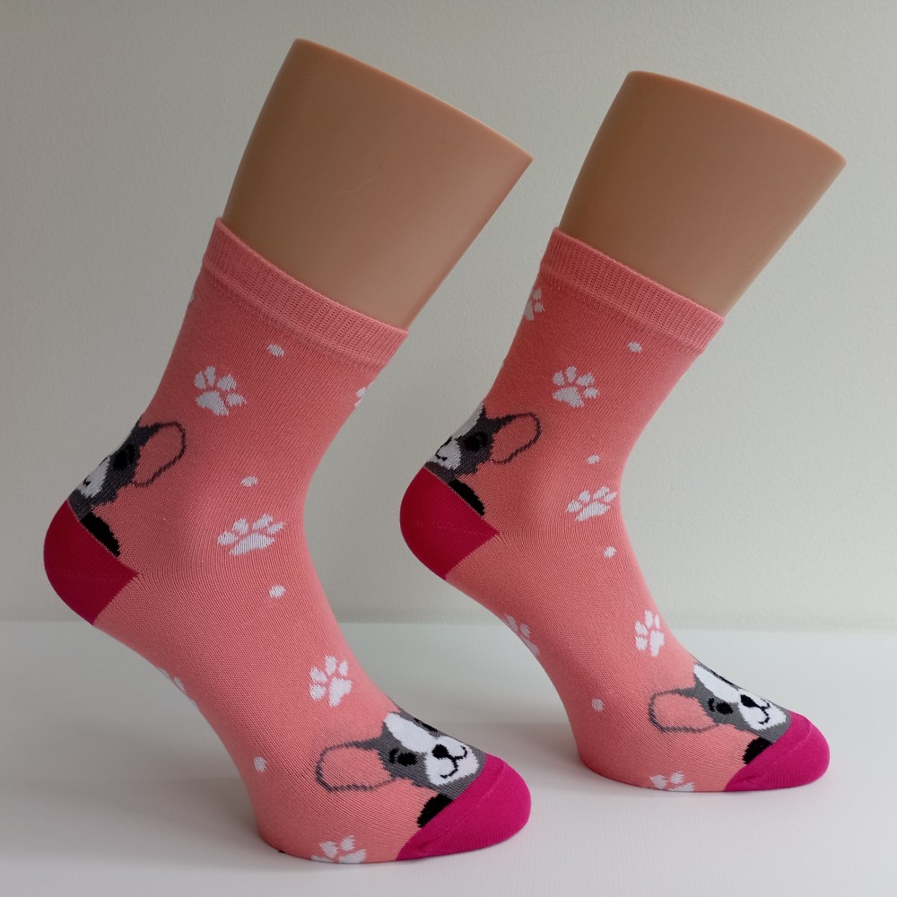 Dívčí ponožky Trepon s pejskem. Originalita, pohodlí, styl. Kousek, který stojí za oživení dětského outfitu. Jsou vyrobeny z jemné bavlny a díky přidanému elastanu se skvěle přizpůsobí tvaru dětské nohy. Ponožky mají komfortní lemy, které se nezařezávají. Špička a pata ponožek jsou zesílené.