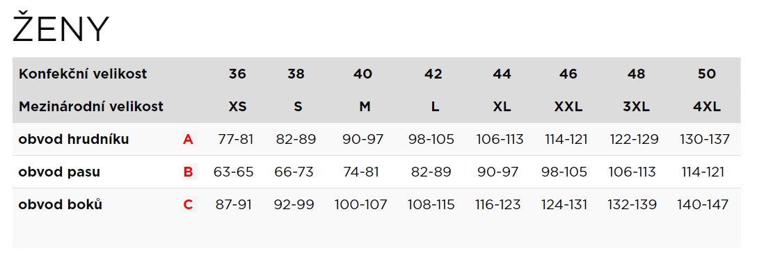 - C - obvod boků: Měříme vodorovně přes nejširší místo boků.