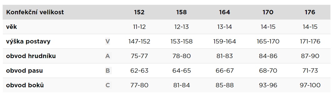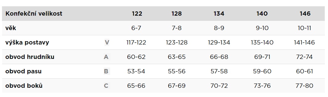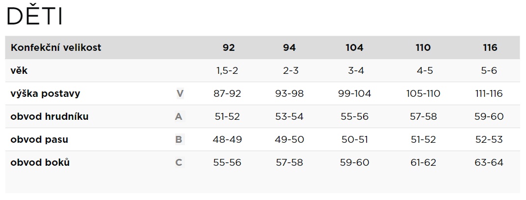 - V – výška postavy: Měříme bez bot, od temene hlavy po chodidlo. Velikost, kterou objednáváte, by měla odpovídat naměřené tělesné výšce v centimetrech. Pokud výška dítěte spadá mezi dvě velikosti, doporučujeme Vám zvolit tu větší.